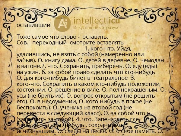 1. кого-что. Уйдя, удалившись, не взять с собой (намеренно или забыв). О. книгу дама. О. детей в деревне. О. чемодан в вагоне.2. что. Сохранить, приберечь. О. еду (еды) на ужин. б. за собой право сделать что кто-нибудь О. для кого-нибудь билет в театральное 3. кого-что. Сохранить в каком кто-нибудь положении, состоянии. О. решение в силе. О. пол некрашеным. О. усы (не брить их). О. вопрос открытым (не решить его). О. в недоумении, О. кого-нибудь в покое (не беспокоить). О. ученика на второй год (не перевести в следующий класс). О. за собой что-н, (закрепить за собой). 4. что. Запечатлеть где -нибудь , на чем -нибудь , сохранить не исчезнувшим. О. следы на песке. О. о себе память. О. след в науке. 5. что. Передать кому-нибудь., предоставить в чье кто-нибудь пользование. О. наследство. 6. кого-что. Побудить, заставить остаться или находиться где кто-нибудь О. гостей ночевать. 7. кого-что. Удалиться от кого-чего -нибудь , покинуть, не имея больше дела с кем-чем кто-нибудь О. семью. Не о. товарища в опасности, О. позади кого-нибудь (опередить). 8. что. Прекратить, перестать заниматься чем кто-нибудь О. прежнее увлечение. О. помыслы, надежды. Оставьте, это не ваше дело. Ах, оставьте, пожалуйста! (выражение несогласия и раздражения). 9. кого-что без чего. Не предоставить чего кто-нибудь О. без подарка. О. просьбу без внимания. 1др.- еврейское и т. п. . (1 и 2 лицо не употребляется, употребляющийся ).В некоторых сочетаниях: перестать существовать, исчезнуть. Силы, мужество оставили кого-нибудь Надежда оставила больного.